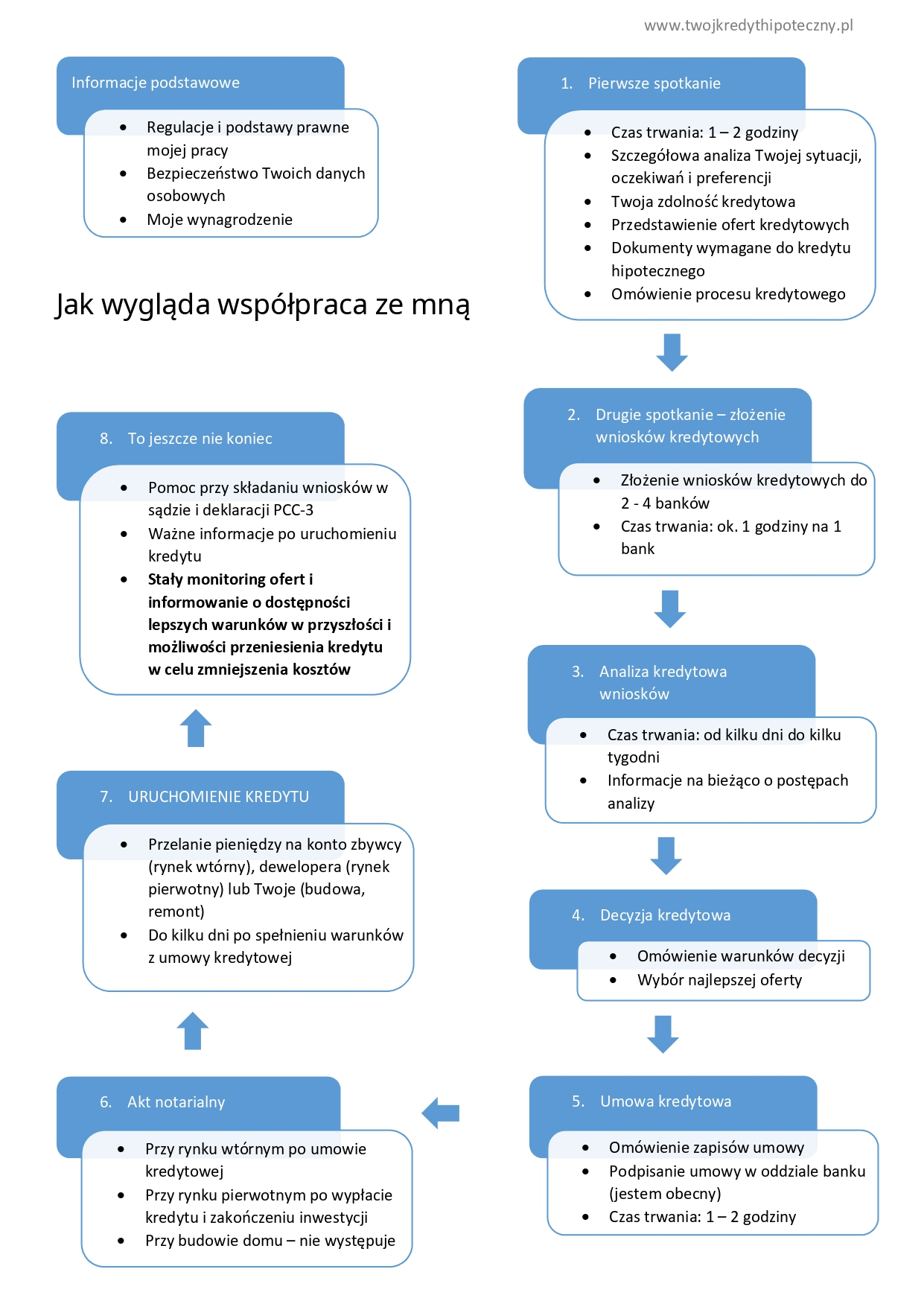 Nie ma co ukrywać, artykuł jest naprawdę dłuuugi 🙂 Czas to dzisiaj luksus, dlatego na początek przygotowałem krótką infografikę, która w prosty sposób pokazuje, jak wygląda współpraca ze mną — od pierwszego kontaktu aż po uruchomienie kredytu.